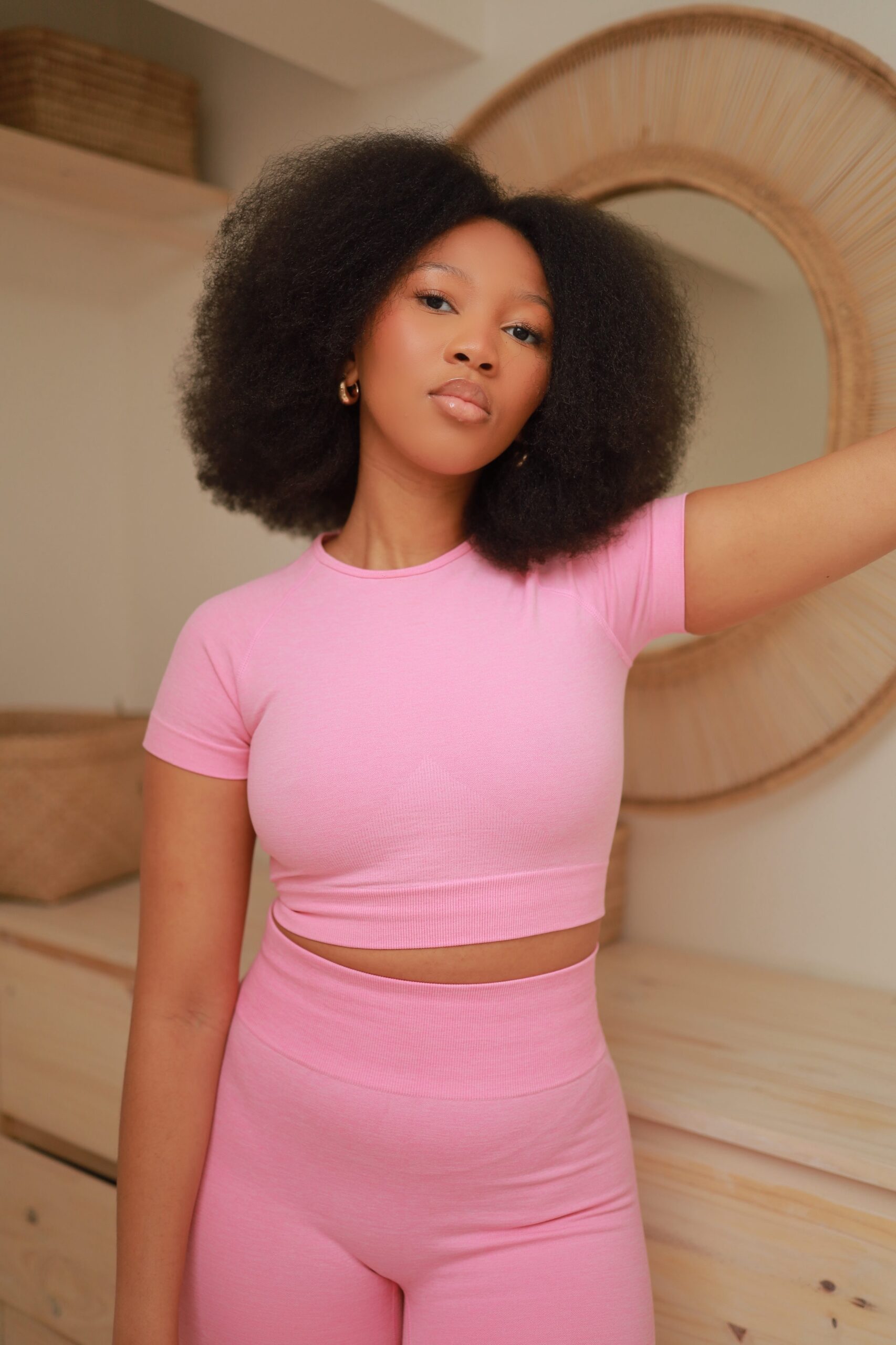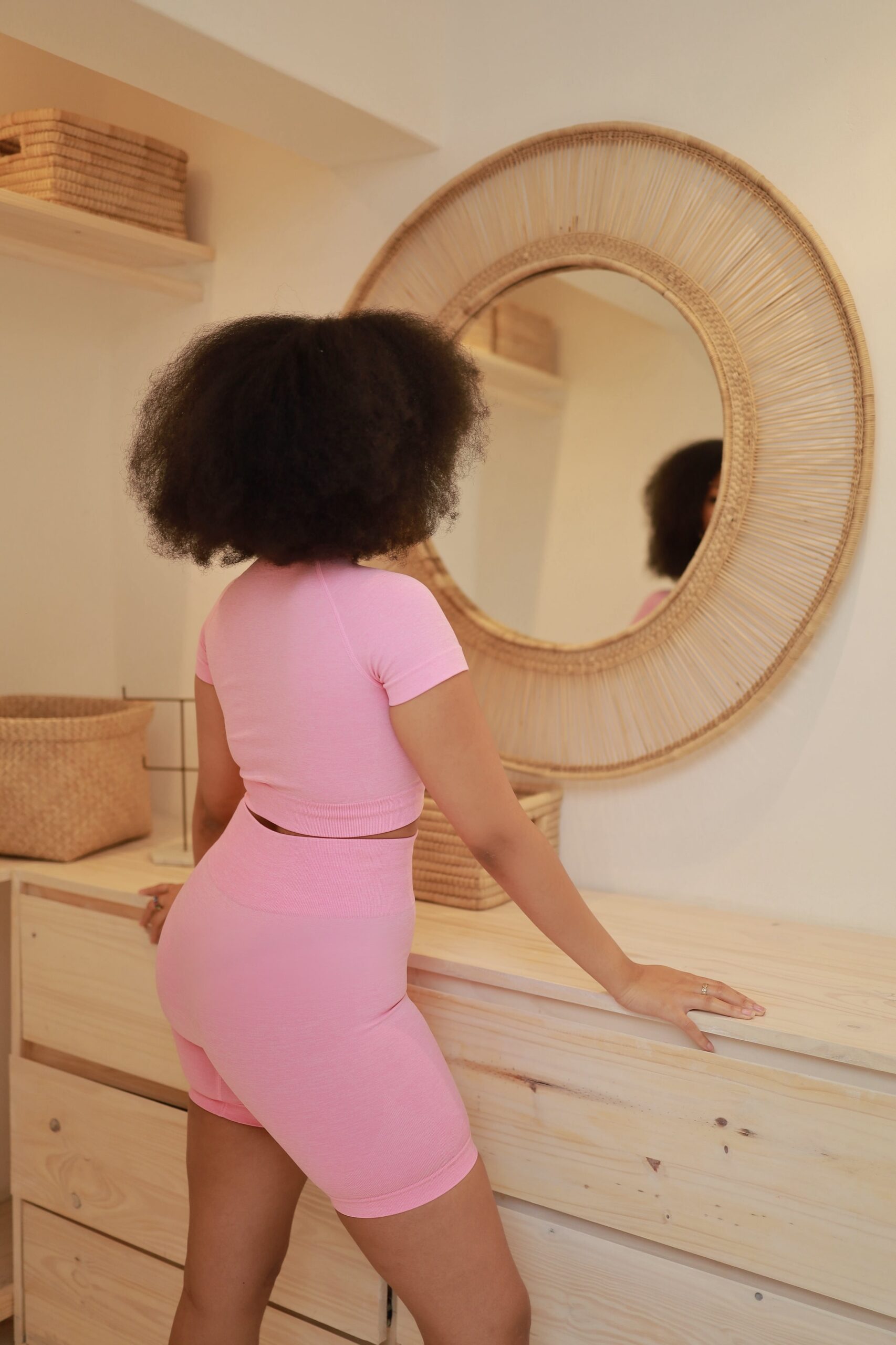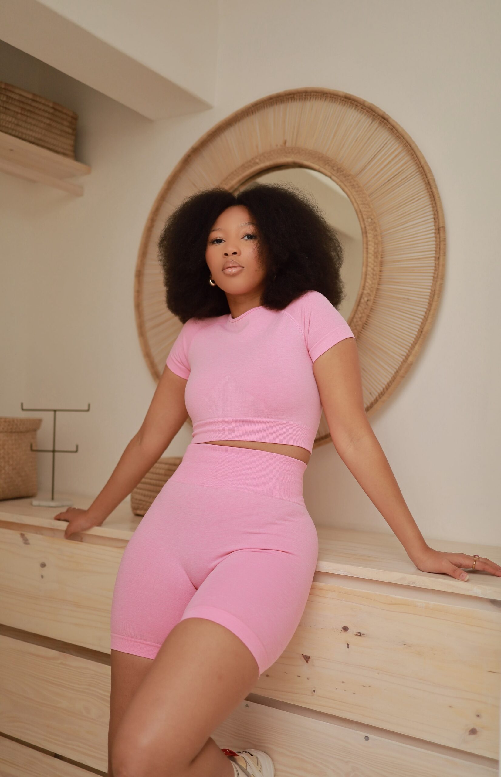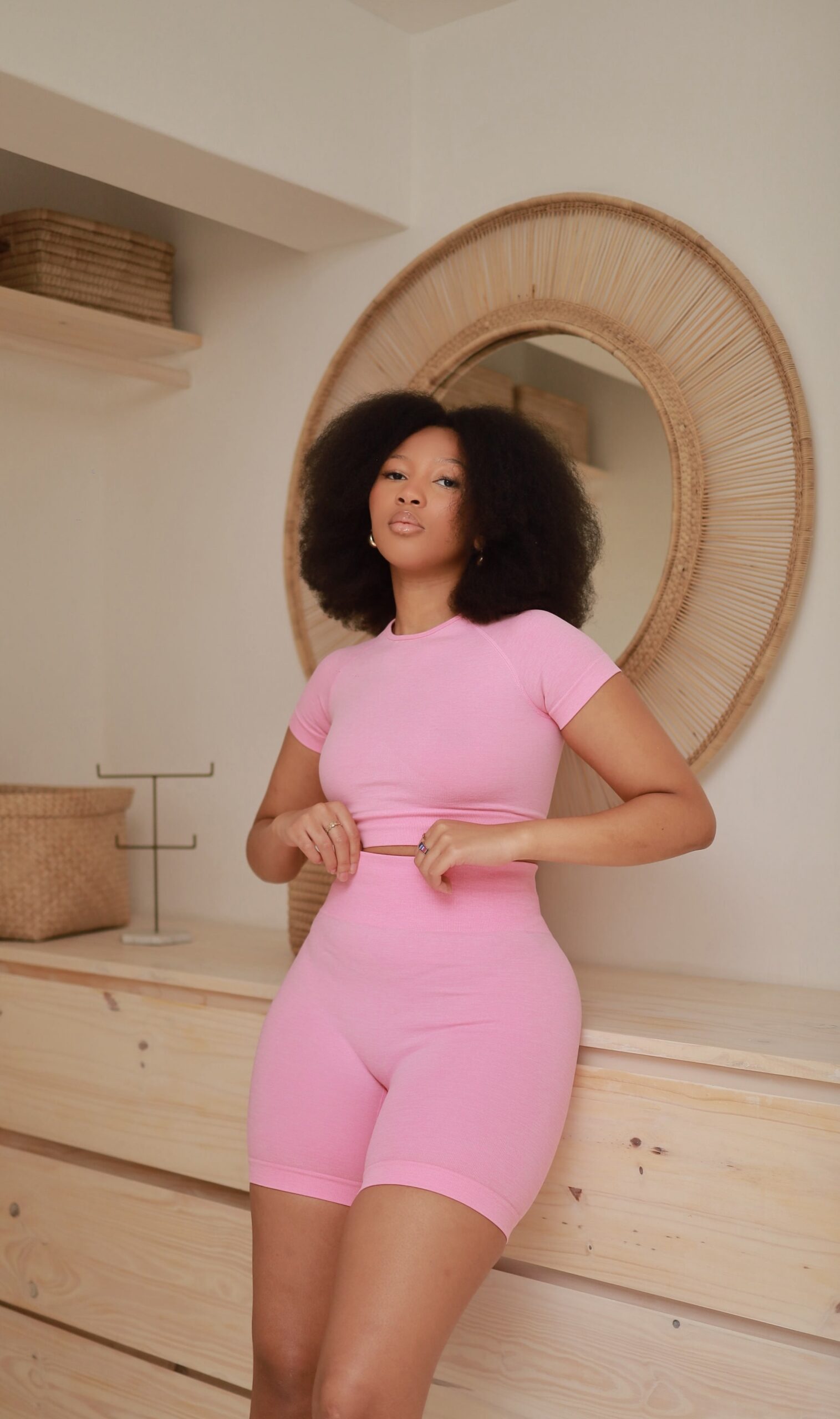 Unveil effortless elegance with our Seamless Two-Piece Shorts Set in Bubblegum Pink. Crafted for both comfort and style, this set features a form-fitting crop top paired with high-waisted shorts, designed to accentuate your silhouette seamlessly.